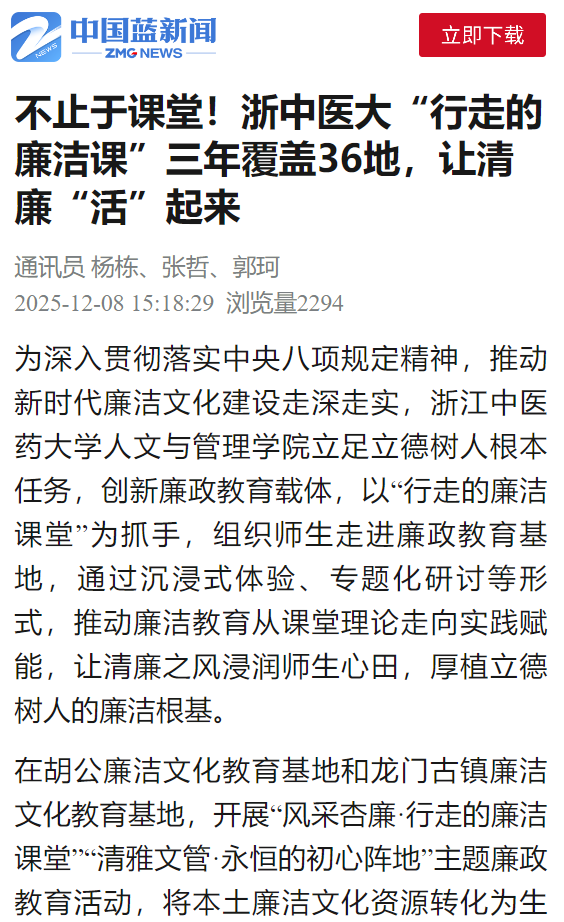 12月8日,中国蓝新闻以“不止于课堂!浙中医大‘行走的廉洁课’三年覆盖36地,让清廉‘活’起来”为题,报道我校人文与管理学院廉洁文化建设工作。